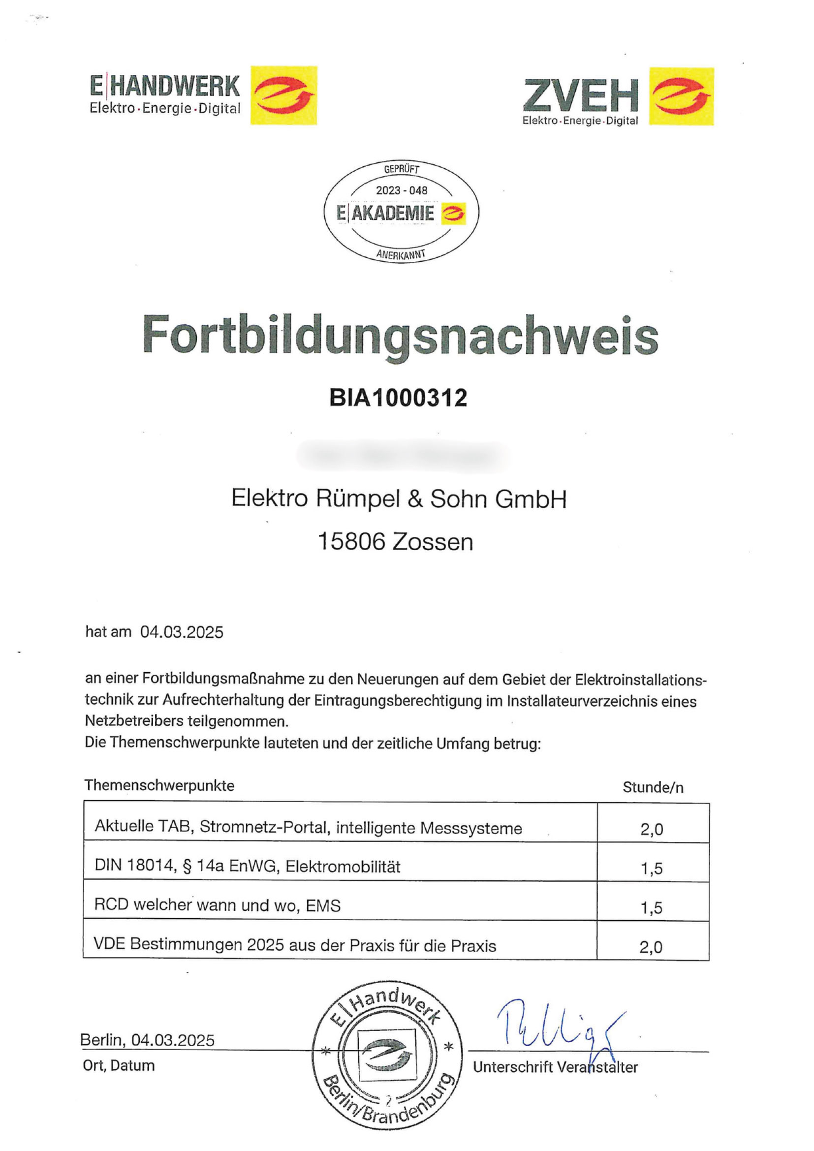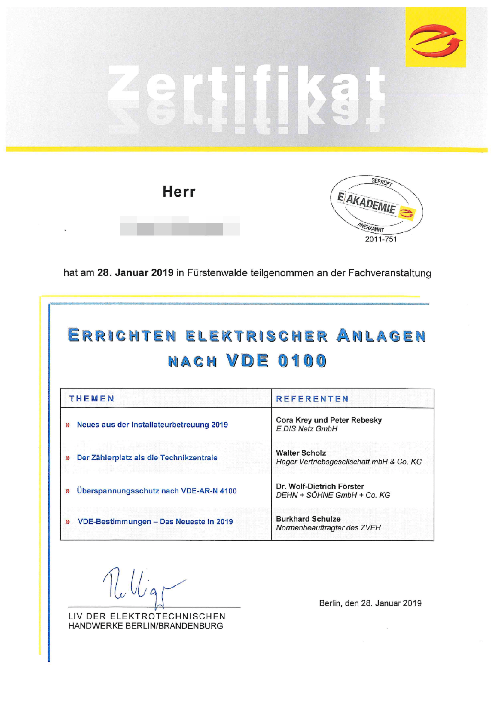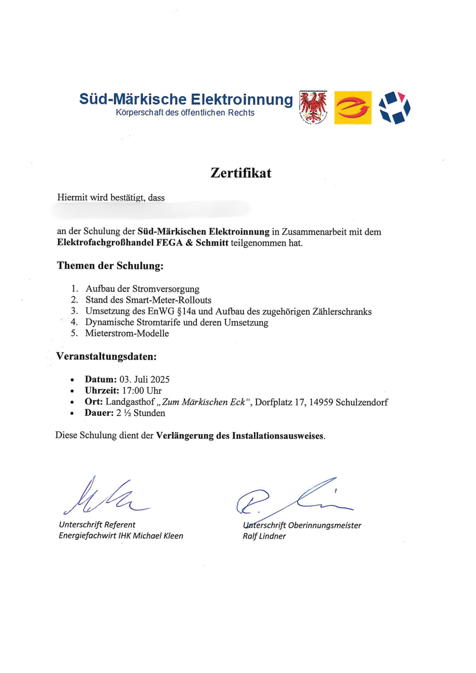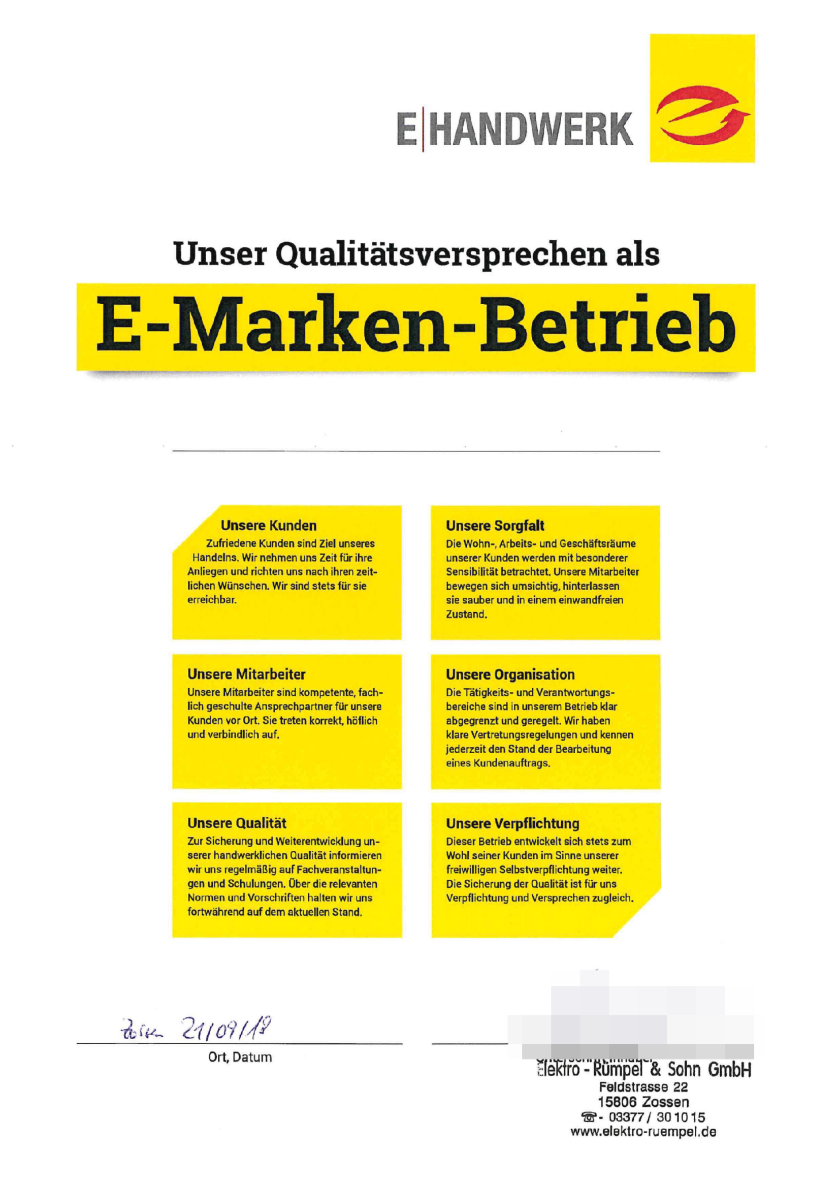 Wir sind Mitglied der Süd-Märkischen Elektroinnung. Eine Innung der Kreishandwerkerschaft Teltow-Fläming. Als zertifizierter Fachbetrieb für E-Mobilität und E-Marken Premium Betrieb sind wir Ihr kompetenter Partner für ein smartes und energieeffizientes Zuhause - von der klassischen Elektroinstallation über nachhaltiges Stromerzeugen mit einer Photovoltaikanlage bis hin zur Elektromobilität. Dabei steht die E-Marke für Ihren qualifizierten Elektro-Innungsfachbetrieb.
