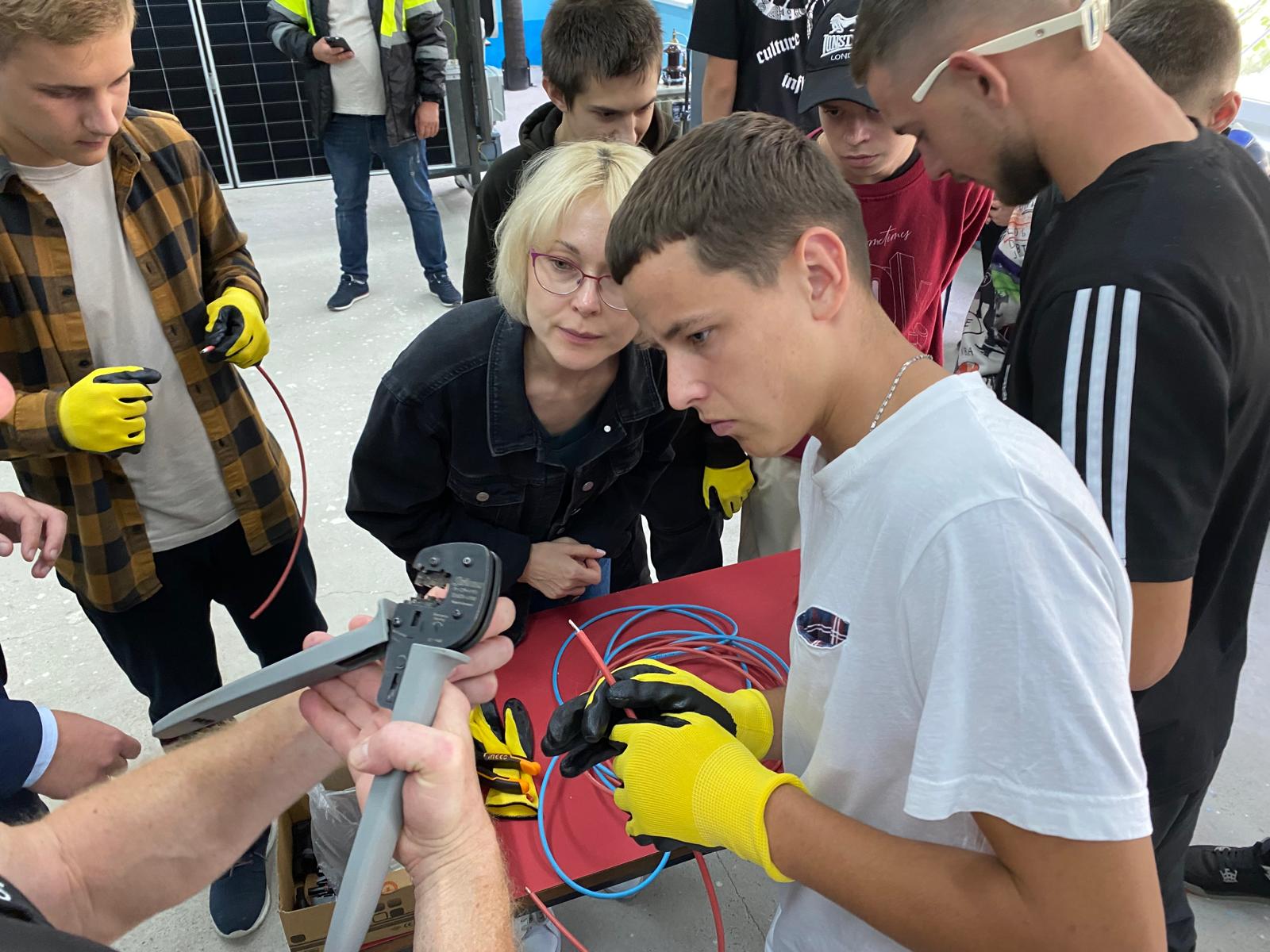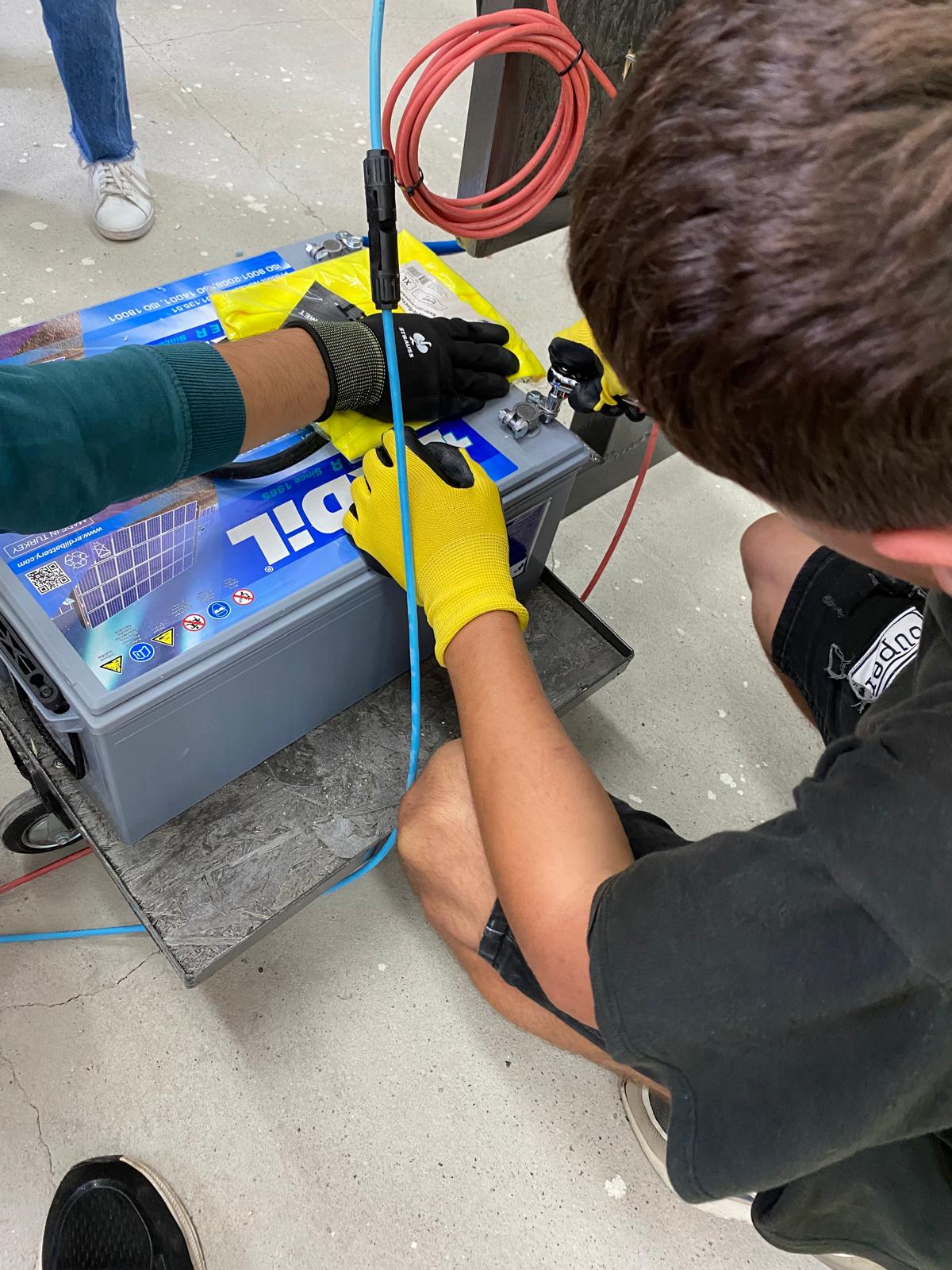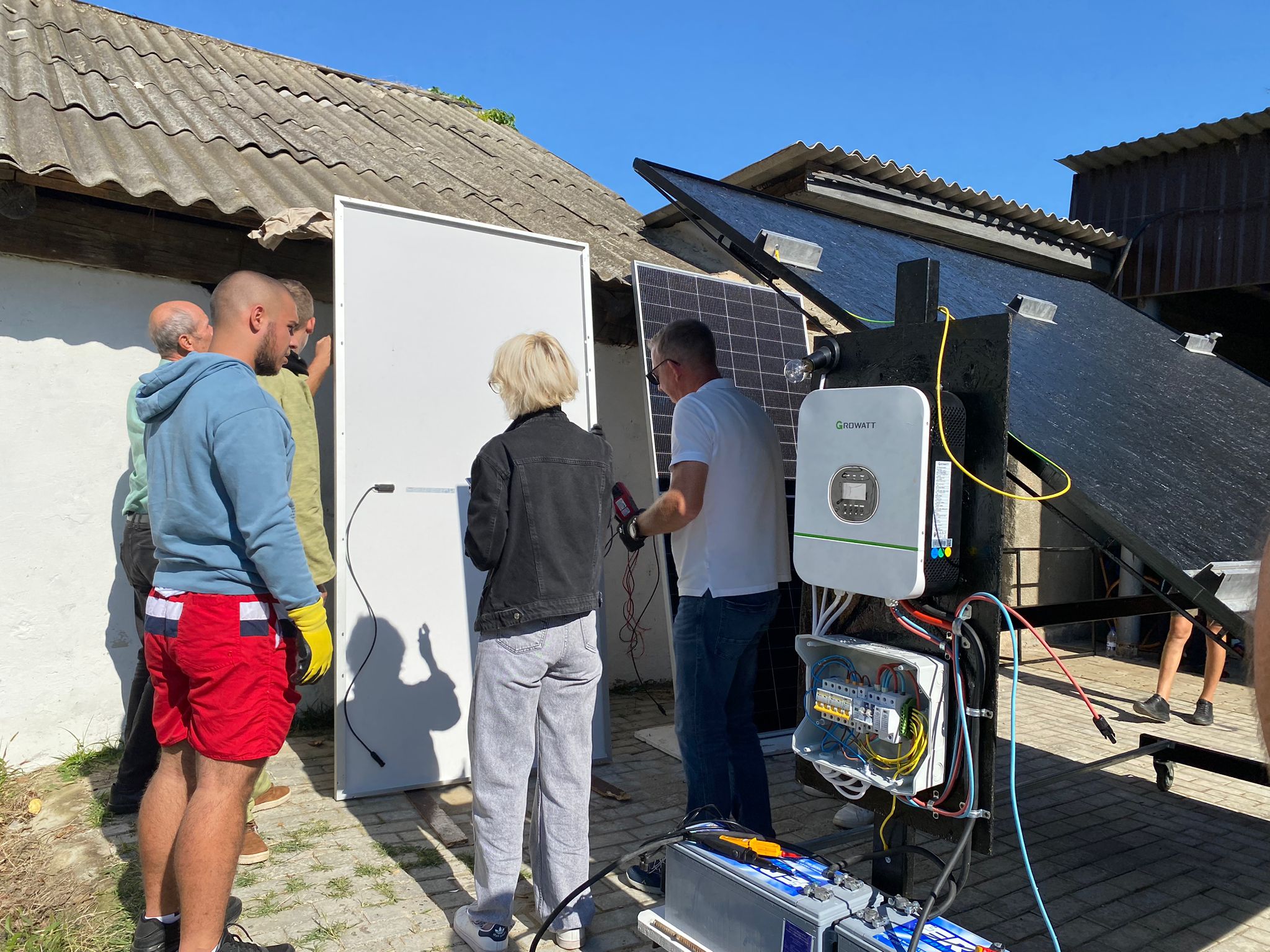 Der zweite Tag startete pünktlich um 9 Uhr mit der praktischen Schulung an der Musteranlage. Bert Rümpel erklärte am Aufbau vor Ort die Funktionsweise einer Off-Grid-PV-Anlage. Die Schüler haben gelernt, welche einzelnen Komponenten es gibt, wo diese lokalisiert sind und welchen Zweck sie erfüllen. Es gibt Basisbestandteile, aber auch Erweiterungsmöglichkeiten. Kein Detail wurde ausgelassen – von Sicherungen, Überspannungsschutz und MC4 Stecker über Kabel und Leitungen bis hin zu den PV-Modulen, Speicher und Unterkonstruktion wurde alles besprochen. Auch Arbeitsschutz und Arbeitssicherheit wurde thematisiert. Besonders große Freude hatten die Schüler am unkonventionellen Zugtest der Steckverbindung mit MC4 Stecker und Buchse. Außerdem konnten sie Messungen an den Modulen durchführen und haben erfahren wie die Messergebnisse richtig ausgewertet, interpretiert und protokolliert werden. Mit verschiedenen Tests haben sie herausgefunden, welche Faktoren den PV-Ertrag beeinflussen können (z.B. Verschattung, Neigungswinkel oder Himmelsrichtung von PV-Modulen).