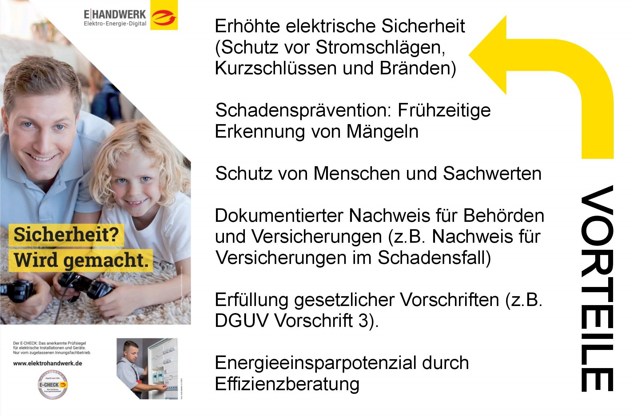 Der E-Check (auch „elektrische Sicherheitsprüfung“ genannt) ist die anerkannte, normengerechte Prüfung der elektrischen Anlagen und aller Geräte im Gebäude. Hier wird geprüft, ob sich die elektrischen Anlagen und Geräte im ordnungsgemäßen Zustand im Sinne der jeweils geltenden VDE-Bestimmungen befinden. Wenn die Anlagen und Geräte in einem einwandfreien Zustand sind, wird die E-Check-Prüfplakette vergeben. Diese ist der Nachweis, dass der E-Check durchgeführt wurde. In einem Prüfprotokoll werden die Prüfergebnisse dokumentiert und zu behebende Mängel festgehalten.